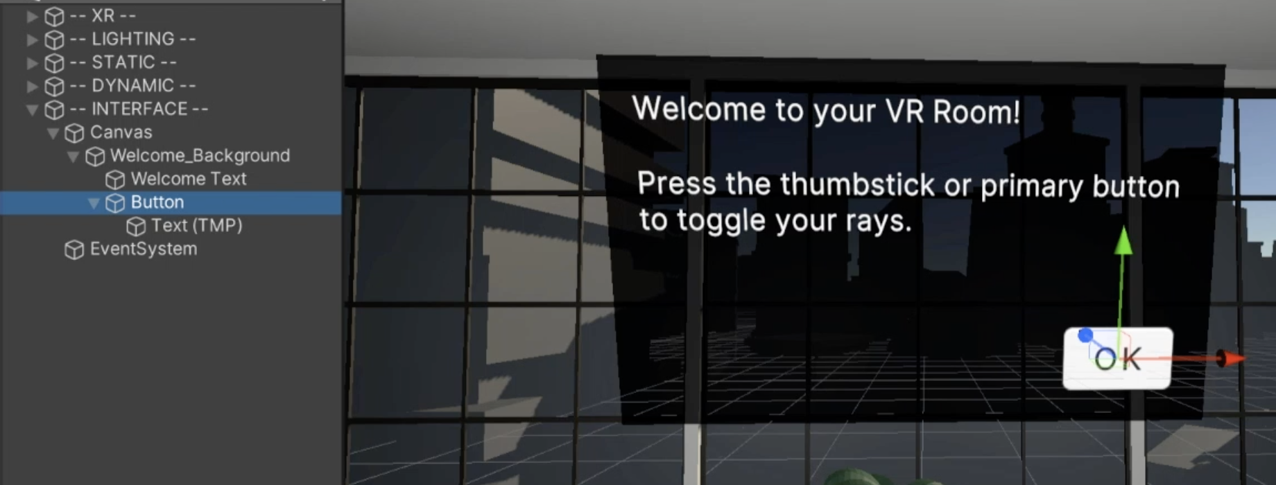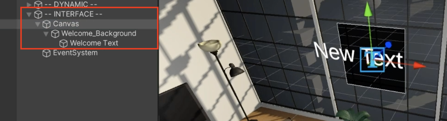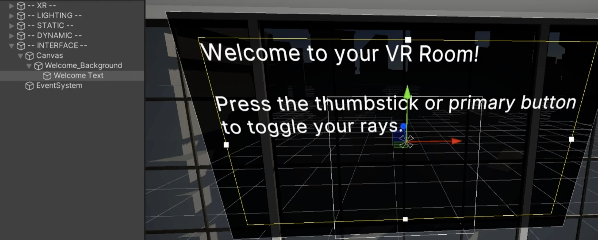 To create some welcome screen text, the first thing you need to do is add a canvas with text and position it in the room.