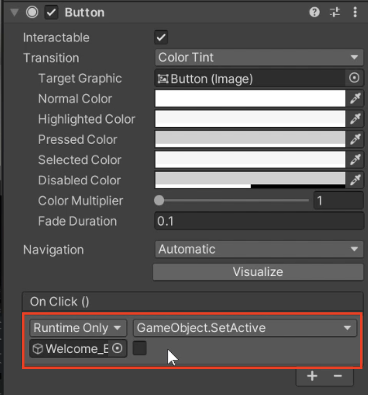 - On the Button object, at the bottom of the Button component, locate the On Click event.