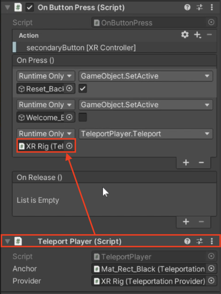 - In the XR Rig object’s On Button Press component, for the On Press event, click the + to add a new function.