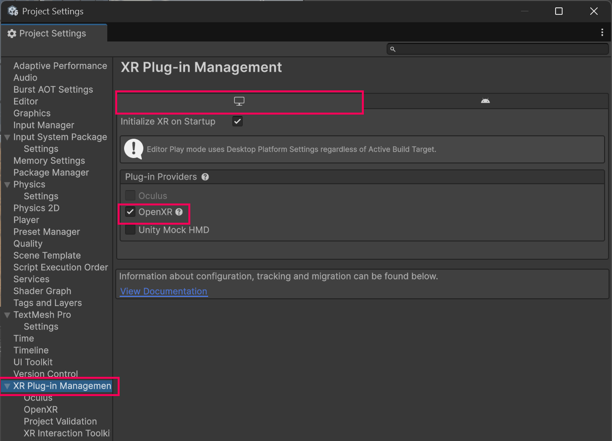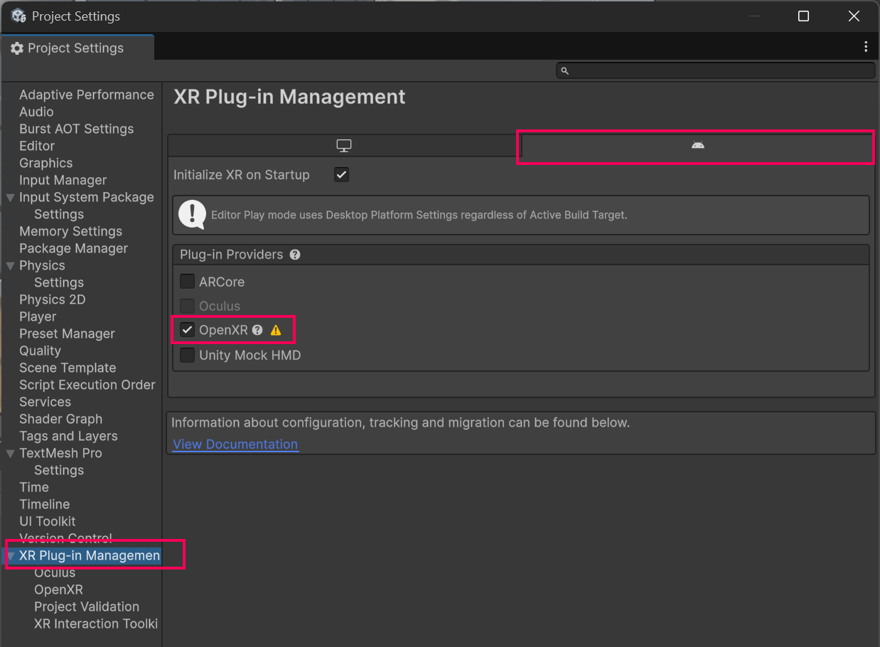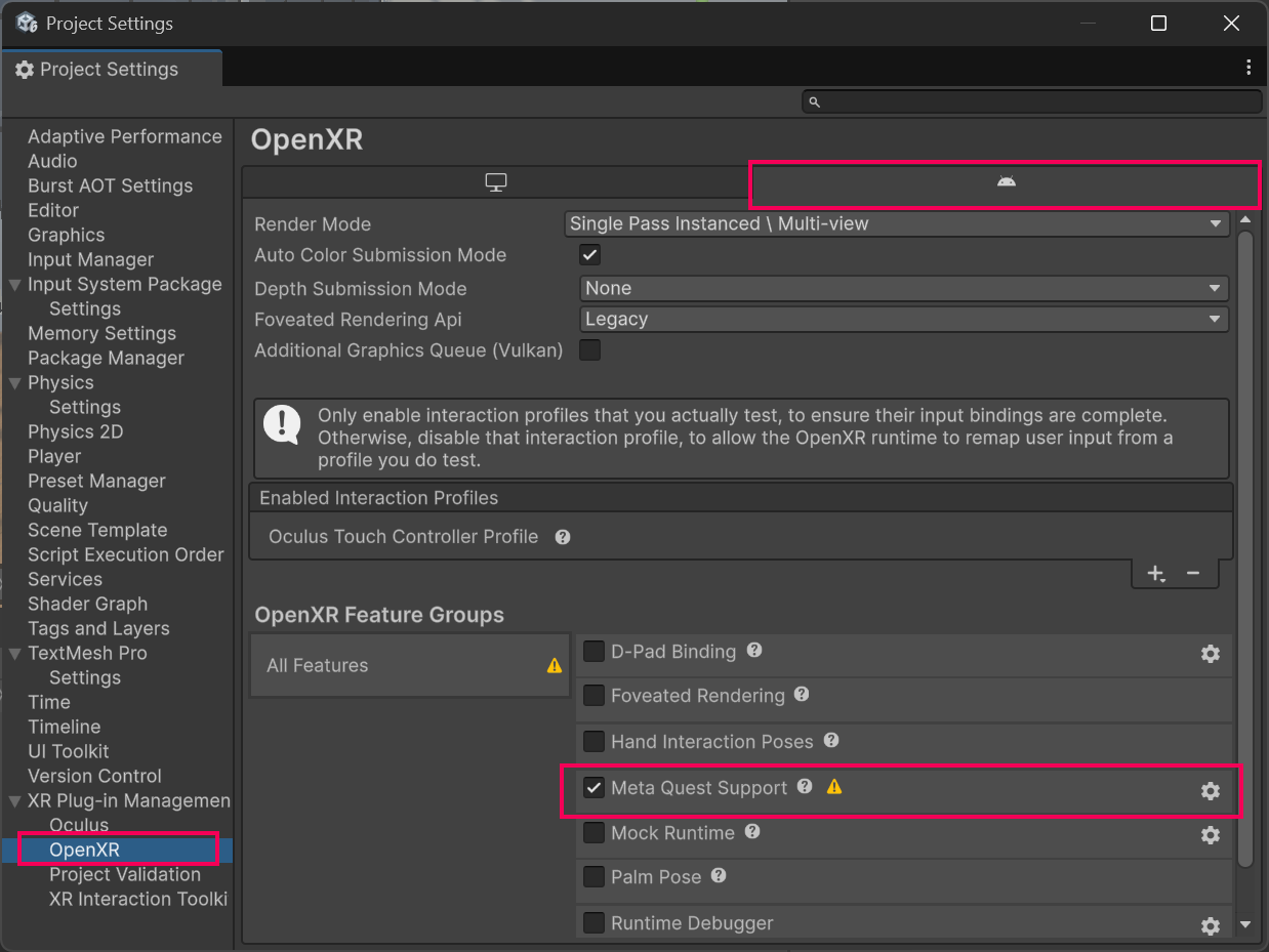 - If you don’t see an option for OpenXR in the Android tab, first go back to the Desktop tab and select OpenXR there, then return to the Android tab.