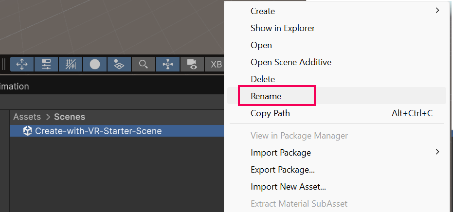 - Right-click the Create-with-VR-Starter-Scene and rename it “[Your_Name] Room”.