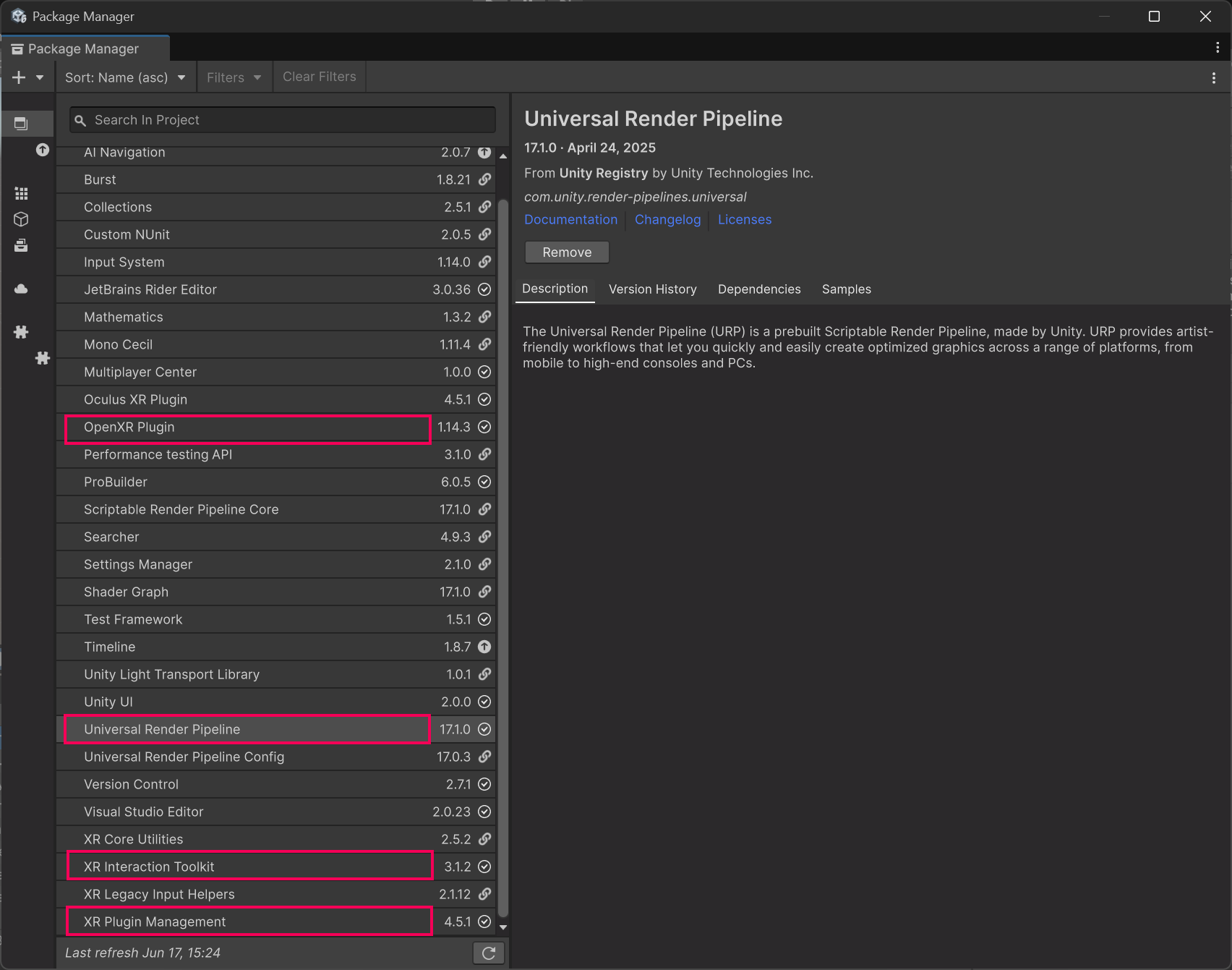 These are the packages needed to enable VR support, interaction systems, and rendering capabilities in your project.