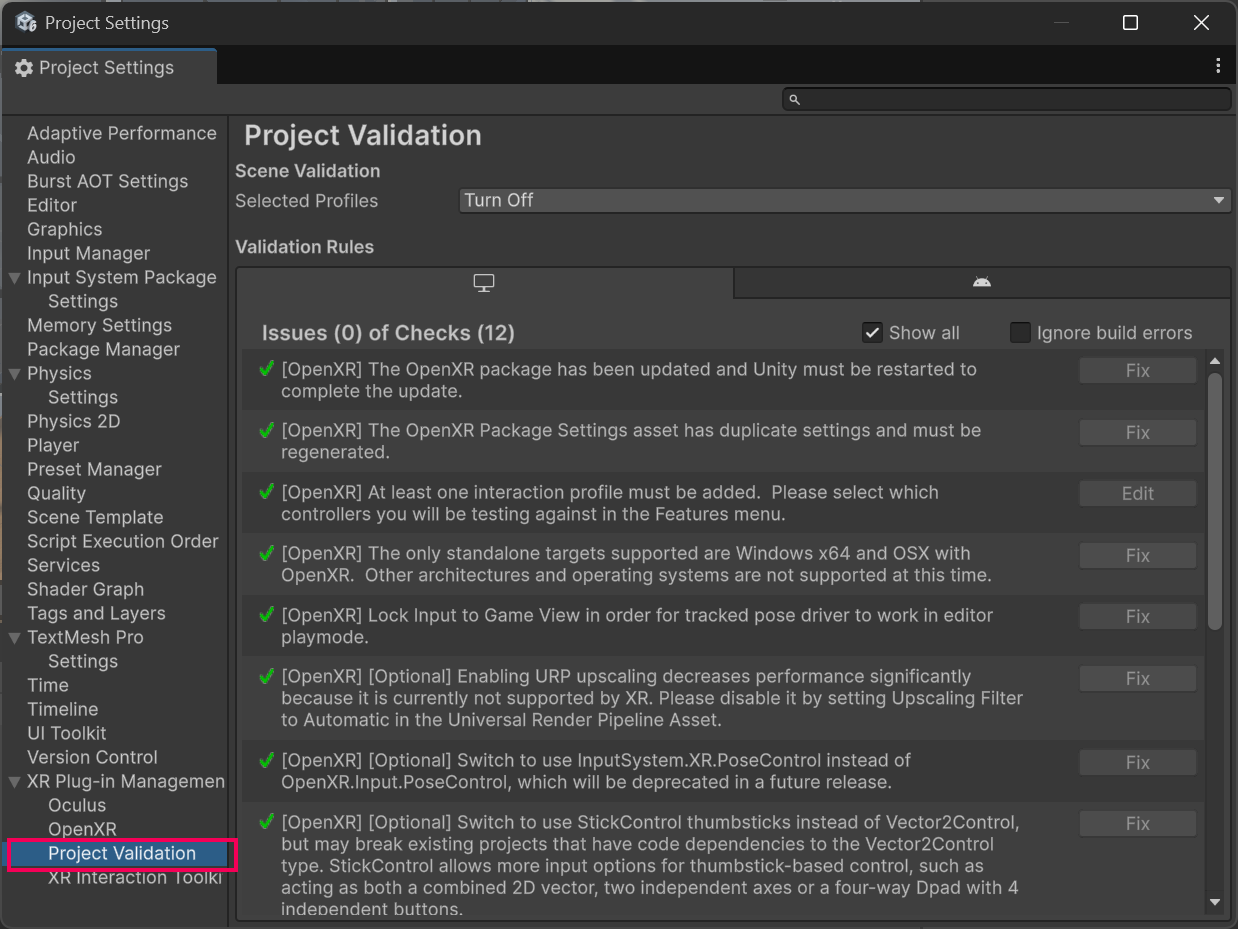 - If you’re having trouble resolving warnings or errors, or if you need help troubleshooting, check out this detailed documentation on configuring the OpenXR plugin.
