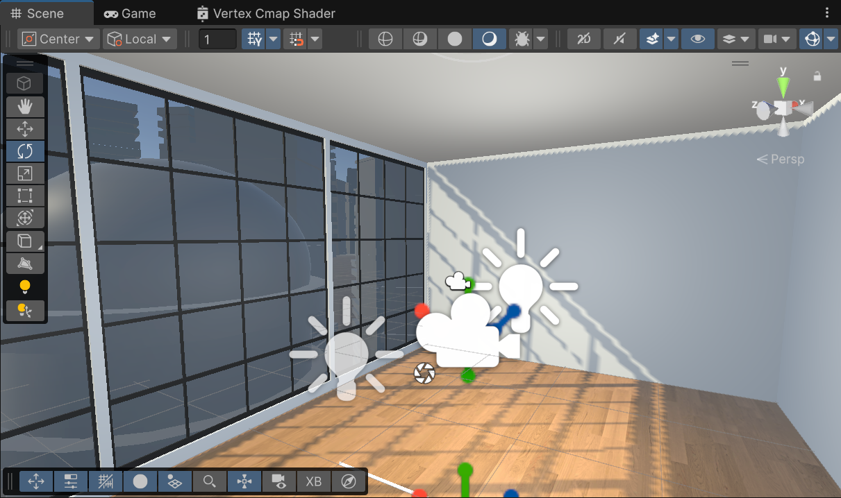 - Change Directional Light GameObject’s Transform component’s Rotation property’s X and Y values to change the way sunlight enters your room.