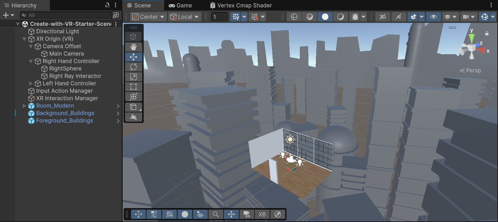 - In the Hierarchy window, use the foldout (triangle) to expand the XR Origin (VR) GameObject.