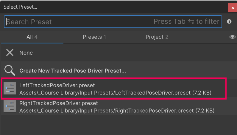 - Repeat this for the RightHand Controller, but this time select the RightTrackedPoseDriver preset.