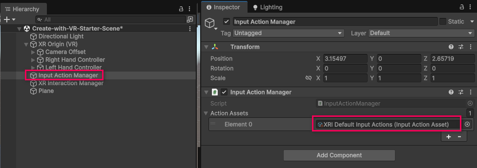 - This XRI Default Input Actions asset defines how your VR headset and controllers send input to your game. The Action Maps on the left group different kinds of inputs (like head tracking or hand movement). The Actions on the right show what’s being tracked (like your head's position and rotation). This setup enables Unity to respond to actions you perform in VR.