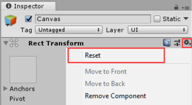 5. Select the Canvas and in the Inspector, click on the gear in the upper-right corner of the Rect Transform component and select Reset. (Figure 03)