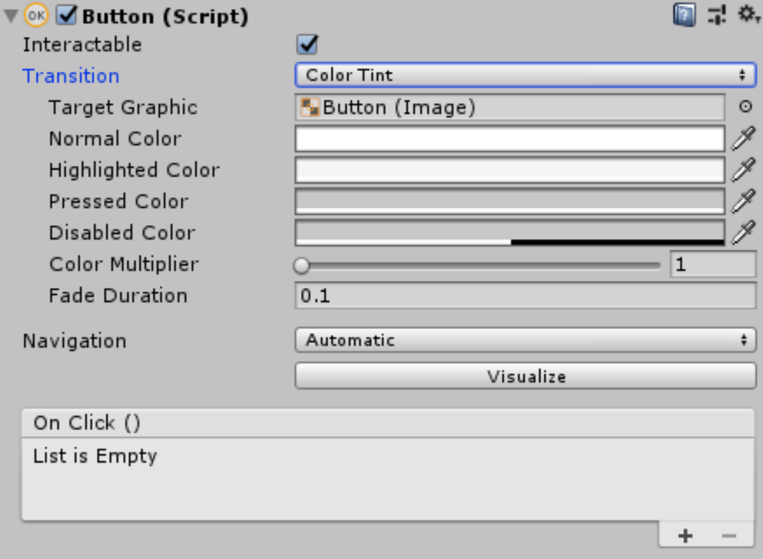 The Button component controls the functionality of the button it’s attached to. The top half of the component focuses on the Button transition, or how it responds when it’s interacted with. By default, this Transition is set to Color Tints, but it can be set to Sprite Swap or Animation. Sprite Swap will change the actual background image of the Button as it’s interacted with, while Animation will allow different animations to play depending on what the Button is doing. The Transition can also be set to None, but it is advisable to at least keep the default Color Tint transition, as this gives the user a visual cue that they successfully clicked the Button. Should the Button need to be disabled for any reason, uncheck the Interactable checkbox above Transition. (Figure 06)