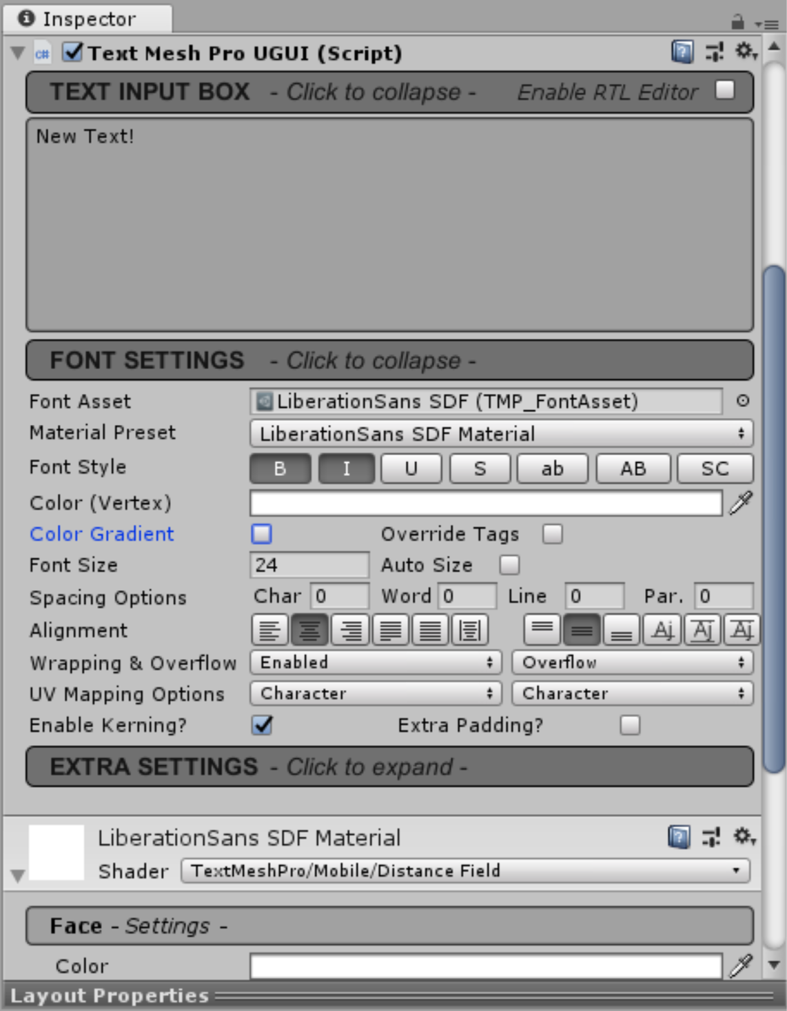 A Button consists of two components: the Button itself, and a child Text component. By default, the text component is standard Unity UI text; however, TextMesh Pro text can now be used for UI components. TextMesh Pro gives designers far more options to work with when creating text for their applications.