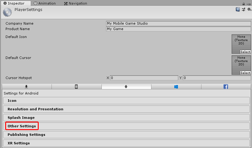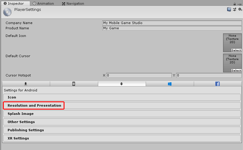 - In the top of the Inspector, fill out your company and product names. For final distribution, it’s recommended that you create an icon for your game to replace the default Unity launcher icon. Depending on the nature of your game, you may also wish to override the default mouse cursor. By default, the cursor hotspot is at position (0,0), the upper left corner of the cursor image. (Figure 01)