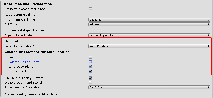 - Set your game’s default and allowed orientations. (Figure 03) For most purposes, “Default Orientation” is best set to Auto Rotation. Most apps and games are designed to run either in landscape or portrait mode, rather than both.