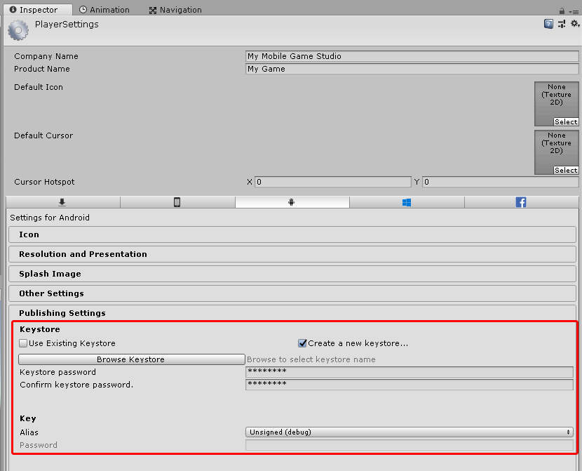 - Finally, before an Android app can be distributed on the app stores, it must be signed with a unique key. Click Publishing to open that section. (Figure 06)
