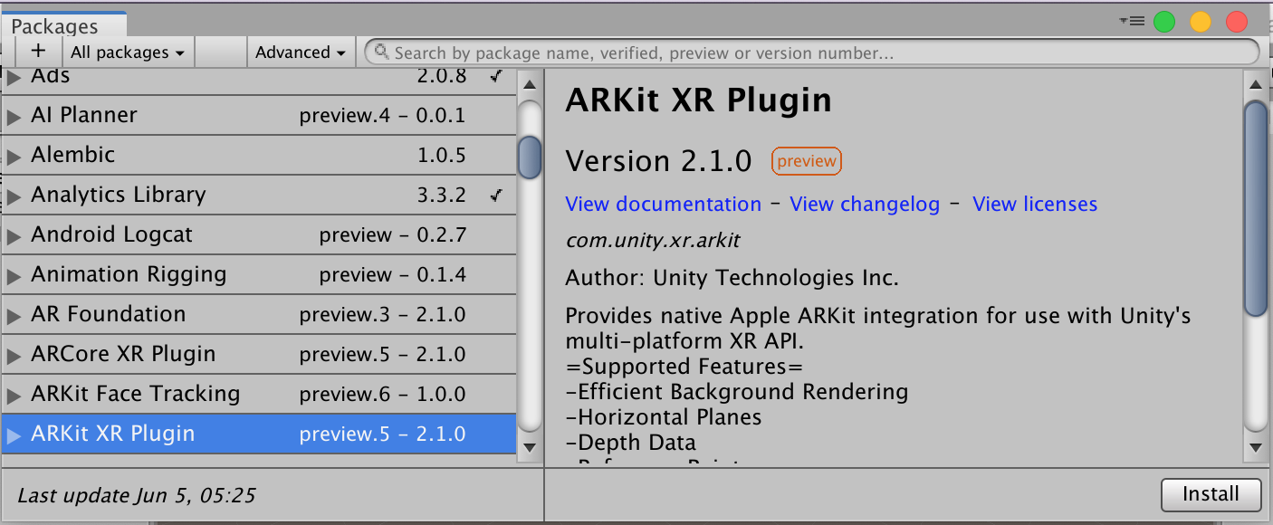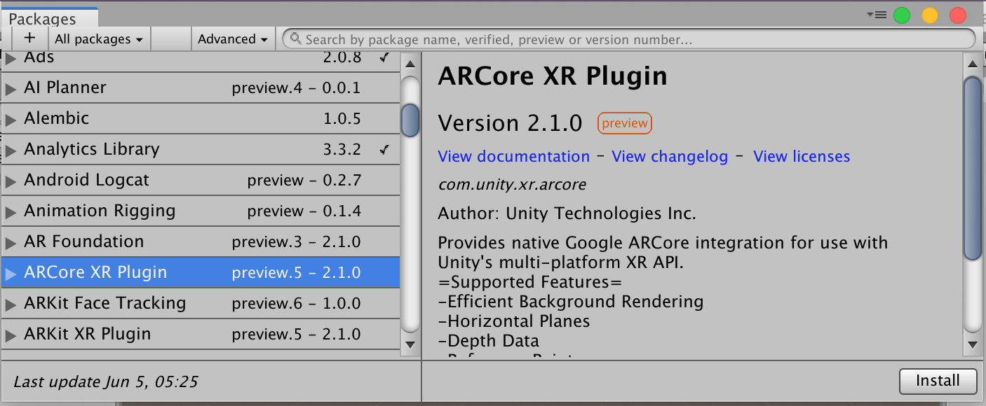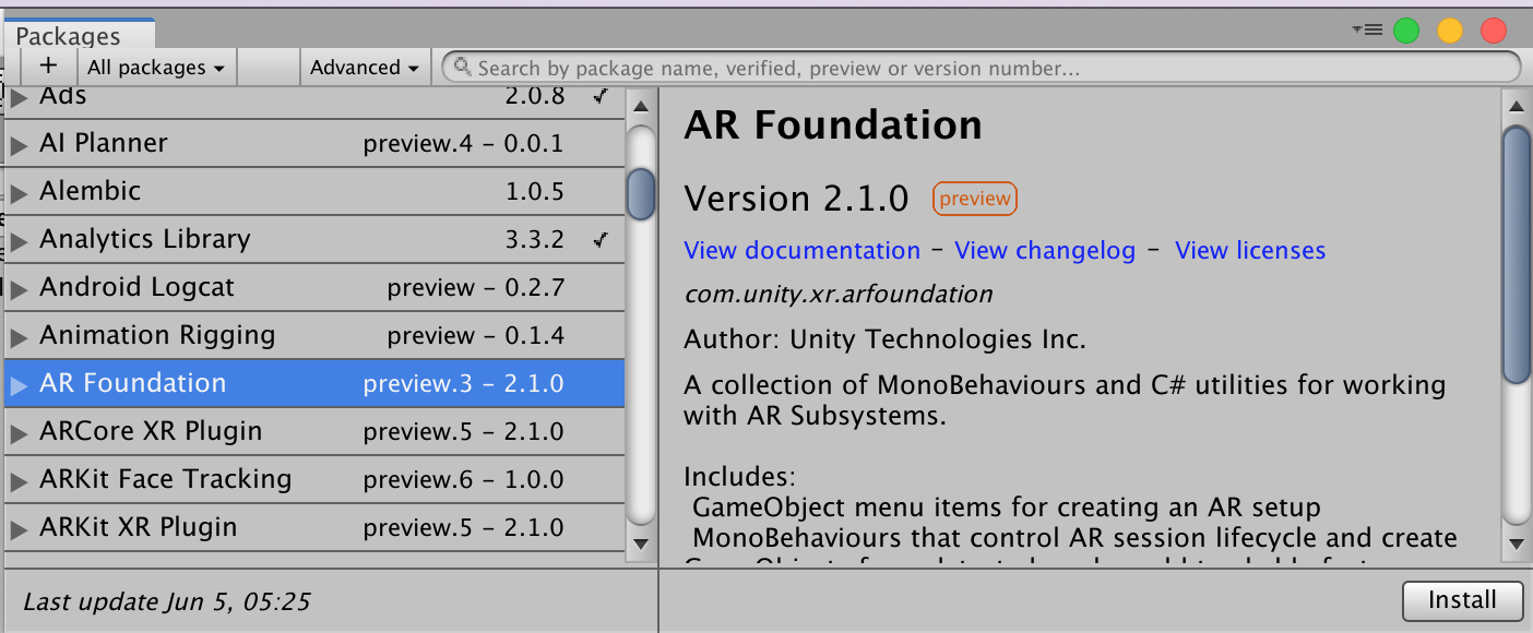 In this workflow, you’ll review the steps needed to set up AR Foundation in your project. The AR Foundation package, in addition to either ARKit and ARCore packages (depending on your target deployment platform), are critical to include when building an AR Unity application and pushing builds to both your Android and iOS devices.