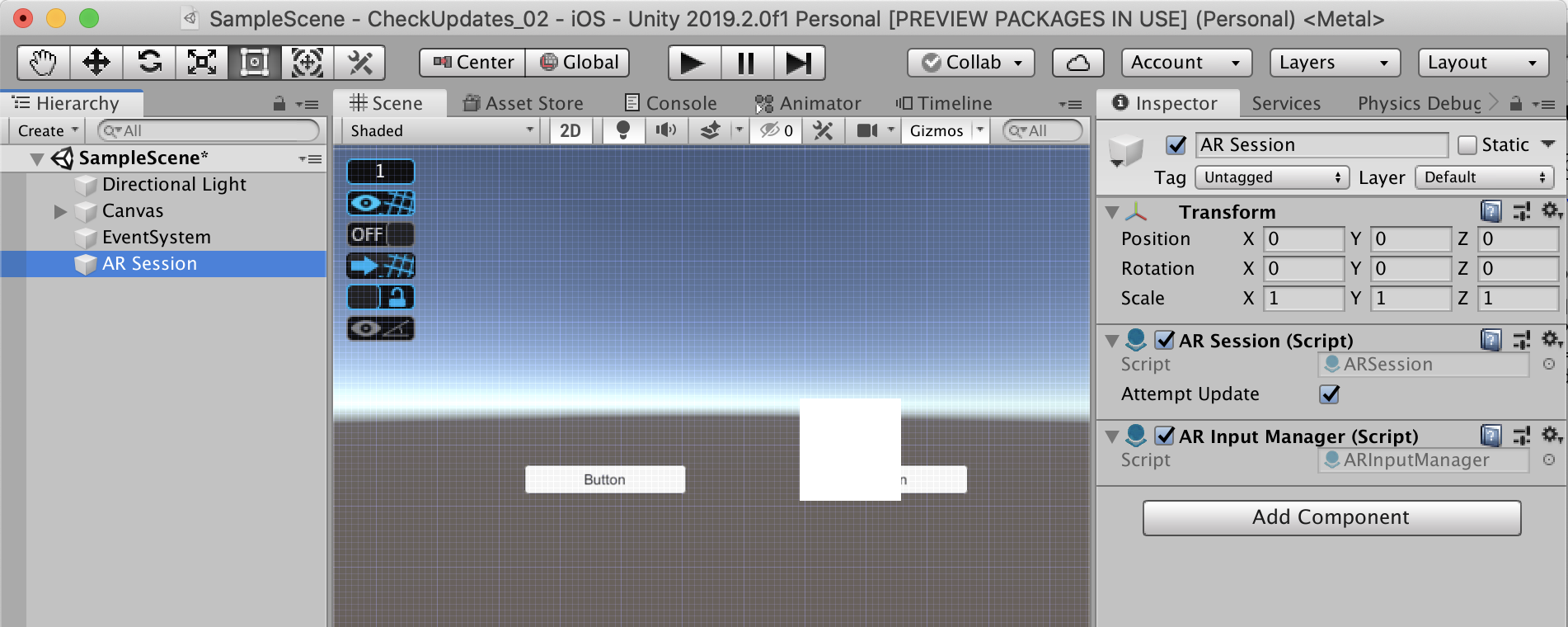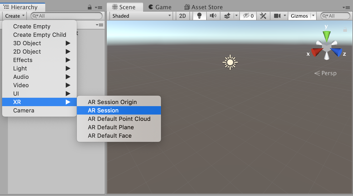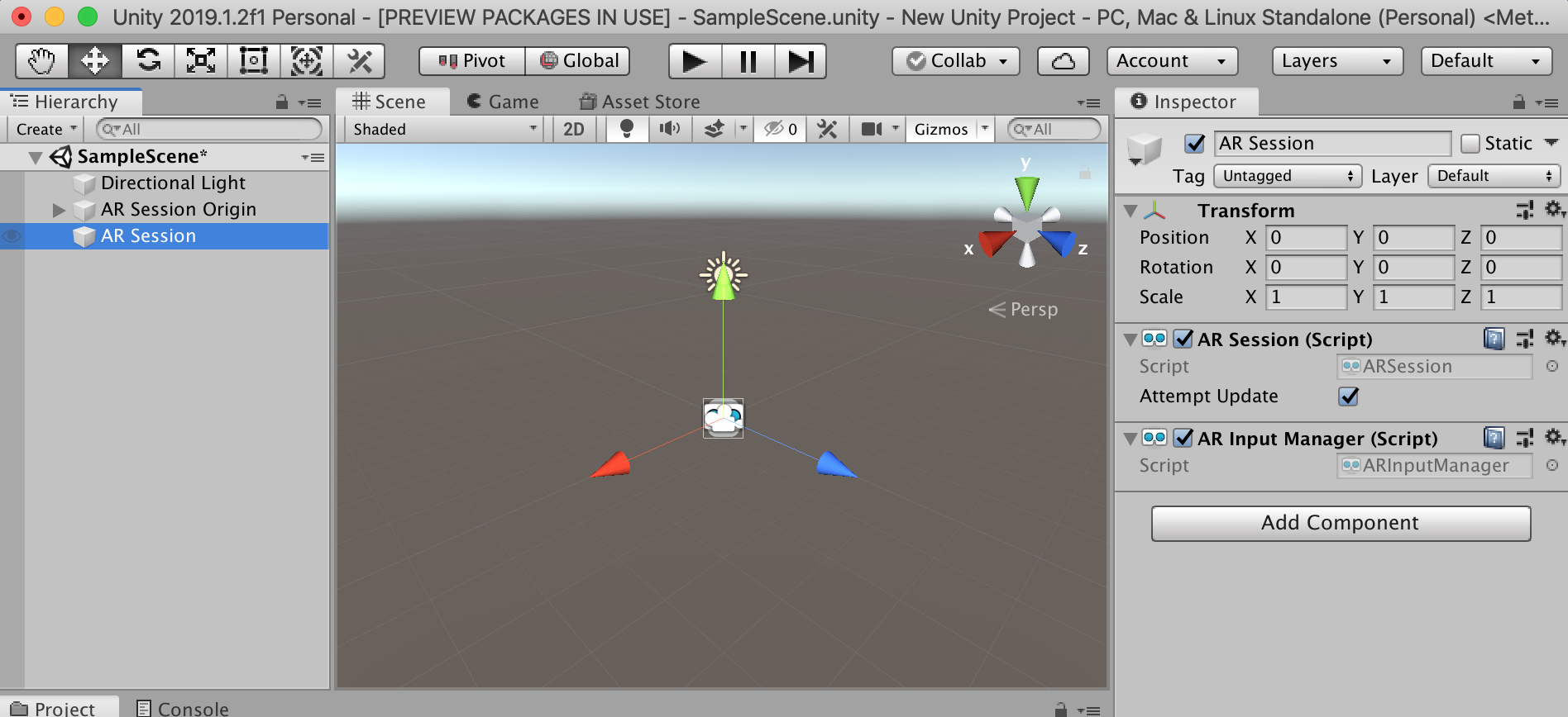 The AR Session must include an ARSession component on one of the GameObjects. By adding an AR Session GameObject, Unity adds a GameObject with the AR Session component automatically attached.
