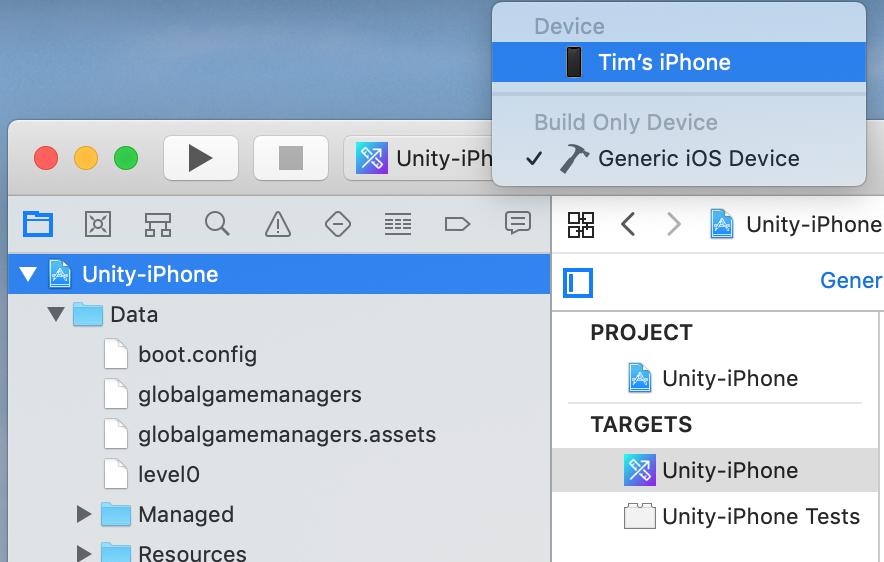 - Select your project in the left window panel and select your target device (plugged into the computer) on the top nav bar by clicking on “Generic iOS Device.” Note: By default, Xcode sets the device to Generic iOS Device (Figure 05).