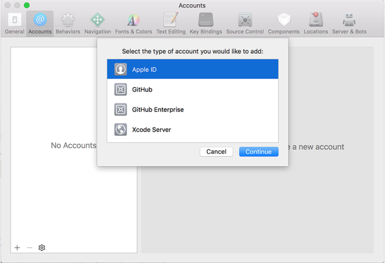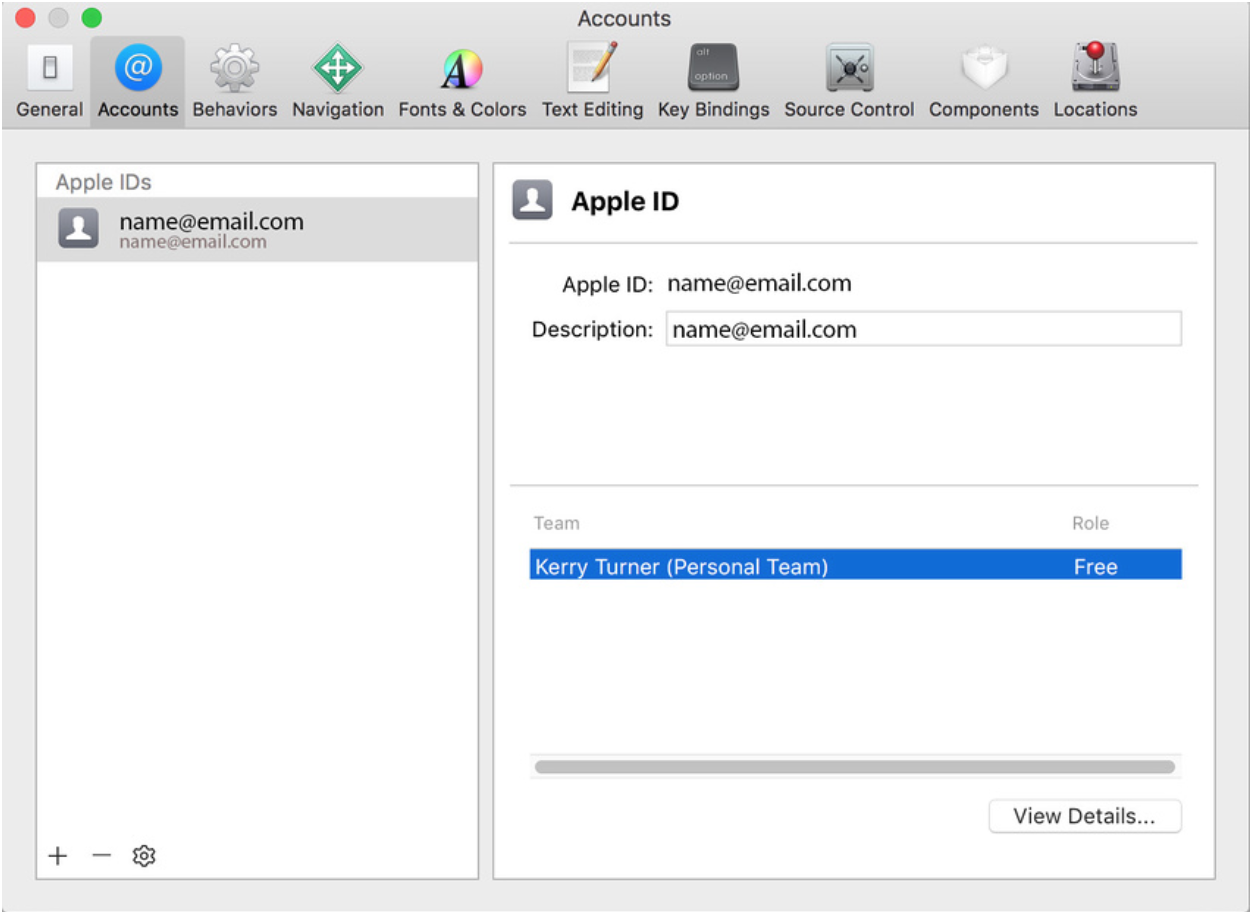 - To display information about the Apple IDs that have been added to Xcode, select Accounts at the top of the window.