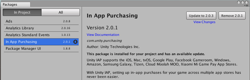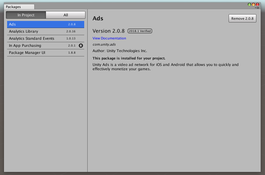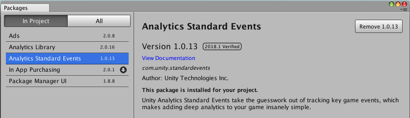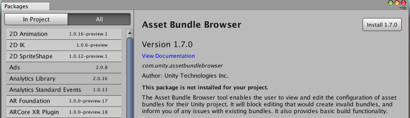 When selecting a Package in either the In Project or All tab, the right pane of the Package Manager will display details about the selected package. Details include name, version number, update status, install and remove buttons.