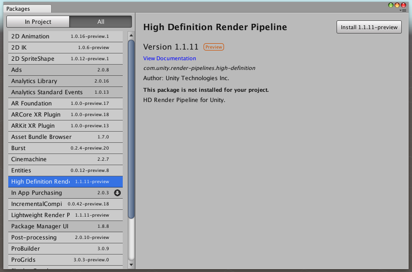 In the left pane The Package Manager lists Packages in two tabs, In Project and All. The In Project tab lists all the Packages currently installed in your Project, and the All tab lists Packages available to install (Figure 03).