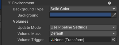 It’s important to note that the Solid Color setting for Background Type in no way affects the lighting in the scene, unlike Skybox. Solid Color simply causes the camera to stop rendering the skybox and replaces it with a color of your choosing. Any modifications made to the skybox will still be visible in the environment even when the skybox is not actually visible in the camera.