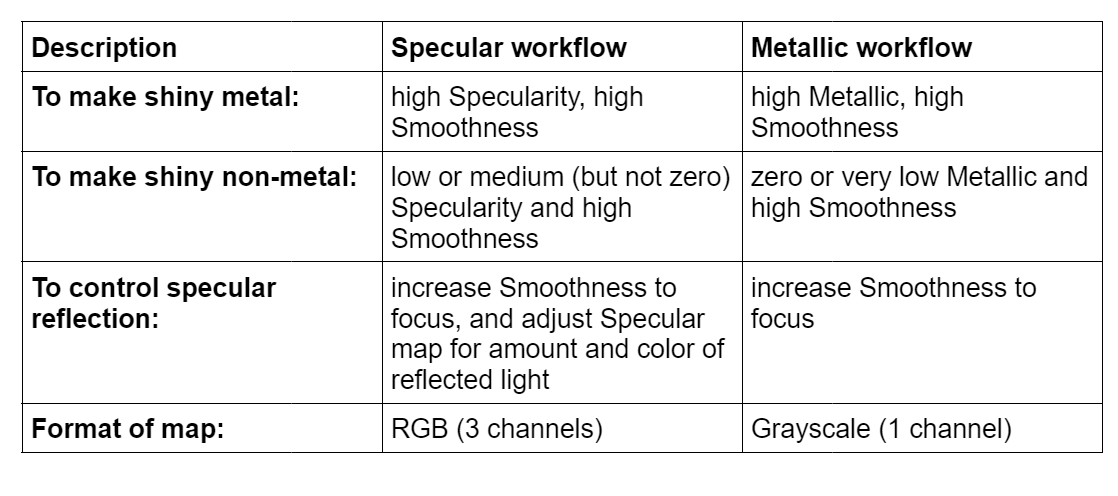 - A shiny metal has a high Specularity setting and a high Smoothness setting.