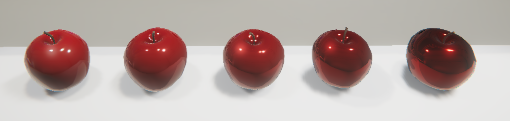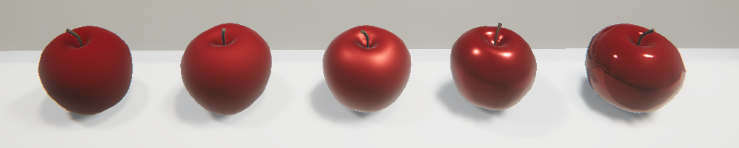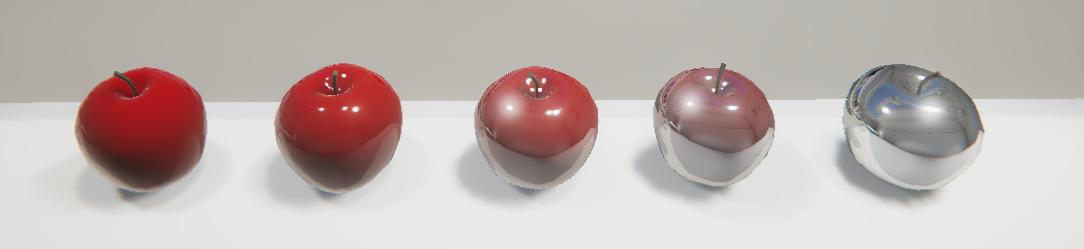 In the image below, all five apples have a Metallic setting of 0.5, with increasing smoothness. On the smoothest one, we can see the lights and reflection of the table.