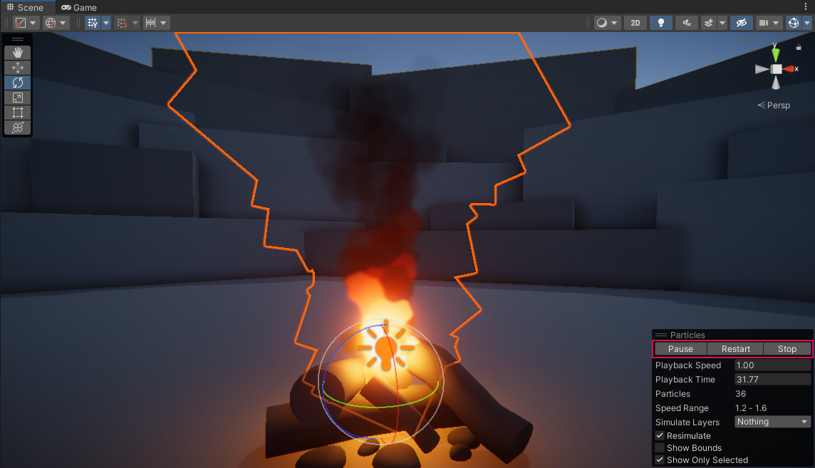 2. In the Particle Effect menu that appears on the right side of the Scene view, select the Pause, Play, Stop, and Restart buttons to control the fire.