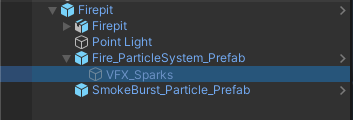 1. In the Hierarchy, expand the Fire_ParticleSystem_Prefab object and select its inactive child object called VFX_Sparks.