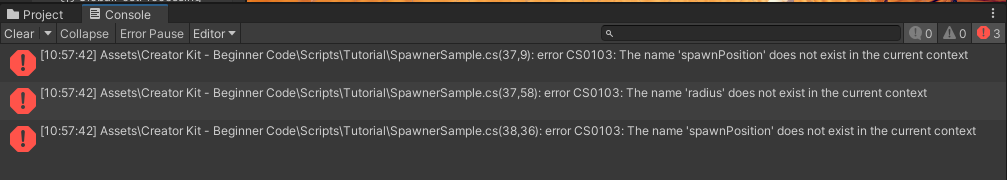 The Console is telling you that the spawnPosition and radius variables do not exist in “the current context” — let’s explore exactly what that means.