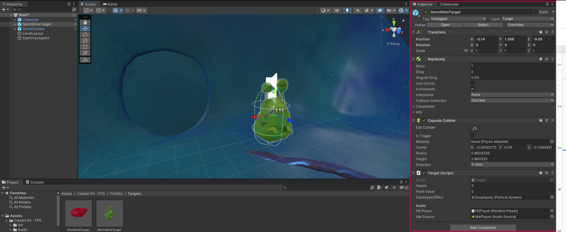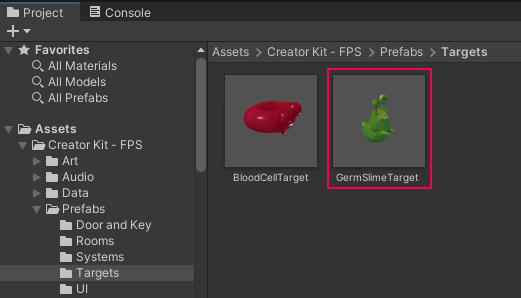 1. In the Project window, go to Assets > Creator Kit - FPS > Prefabs > Targets. Select the GermSlimeTarget Prefab.