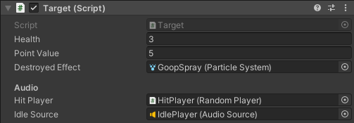 To make sure that the correct audio plays when the germ is hit, you need to add GameObjects to the Target component: