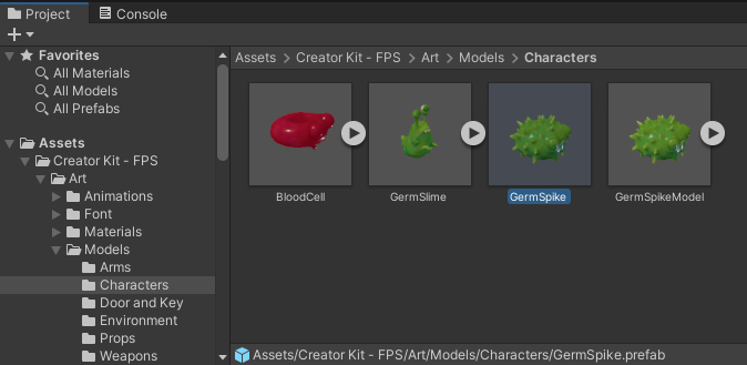 1. In the Project window, go to Assets > Creator Kit - FPS > Art > Models > Characters, and select GermSpike.
