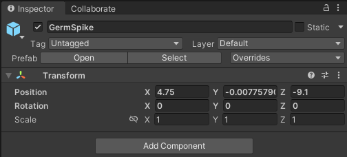 A Sphere Collider will make sure the germ can be hit; this is sometimes called a ‘hitbox’. In the Scene view, you will see the Collider as a green sphere around your germ.