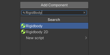 4. Click the Add Component button, and begin typing “Rigidbody” into the search bar.