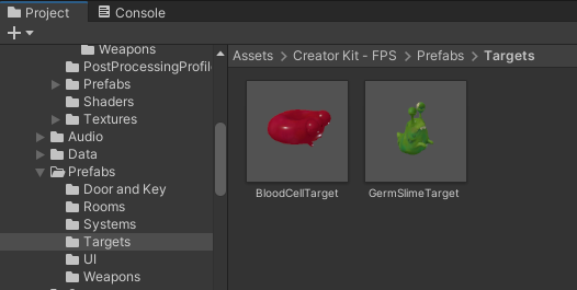 1. In the Project window, go to Assets > Creator Kit - FPS > Prefabs > Targets.