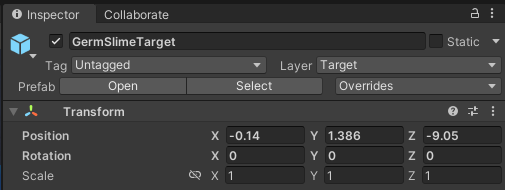 1. In the Scene view, click on the GermSlimeTarget.