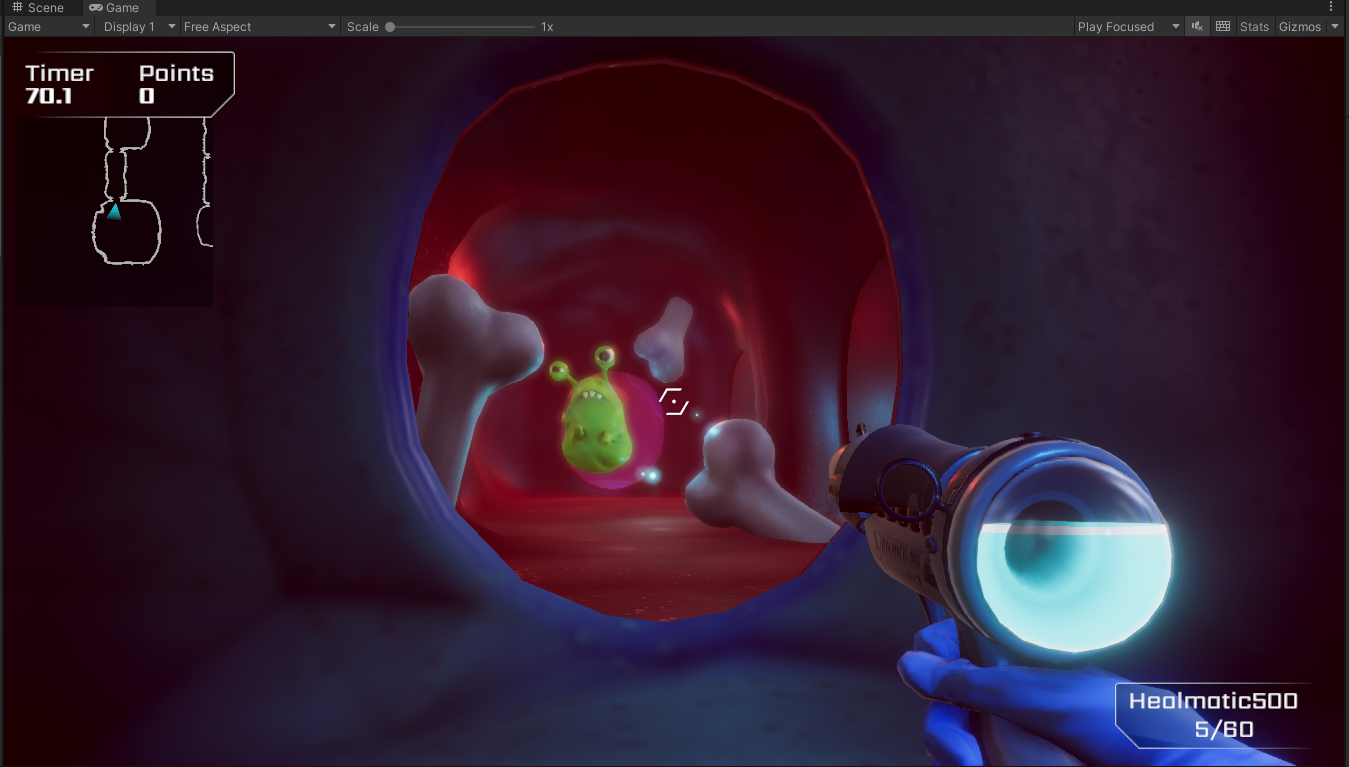 Destroying germs gives you points and uses up medicine ammunition. You can see your point score in the top left corner of the screen, and your remaining medicine for the weapon in the bottom right.