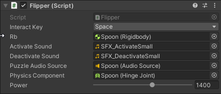 All the InteractivePuzzlePieces have a script component which tells them how to move — the spoon’s is called Flipper.