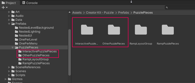 1. In the Project window, go to the file path Assets/Creator Kit - Puzzle/Prefabs/PuzzlePieces.