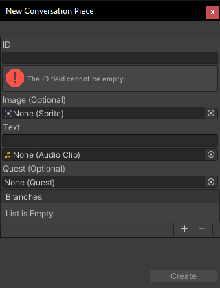 4. Click the + button to add a new Conversation Script Item. This will open the New Conversation Piece window: