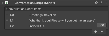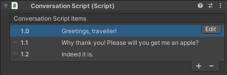 3. In the Conversation Script Items list, select Script Item 1.0 (“Greetings, traveller!”) and click Edit.