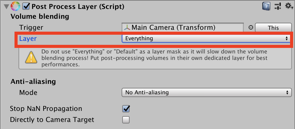 6. On the Post Processing Layer Component on the camera you will need to change the Layer from none to Everything for this demo in order to see any effects you added.