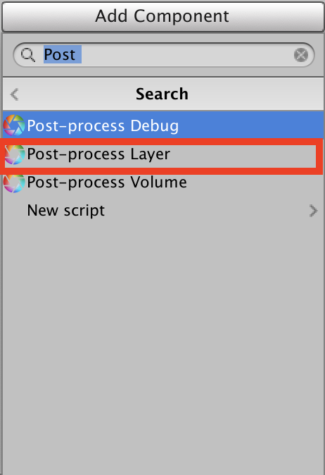 Or, you can drag the script onto the camera or use the Component dropdown and select Rendering > Post Processing Layer.