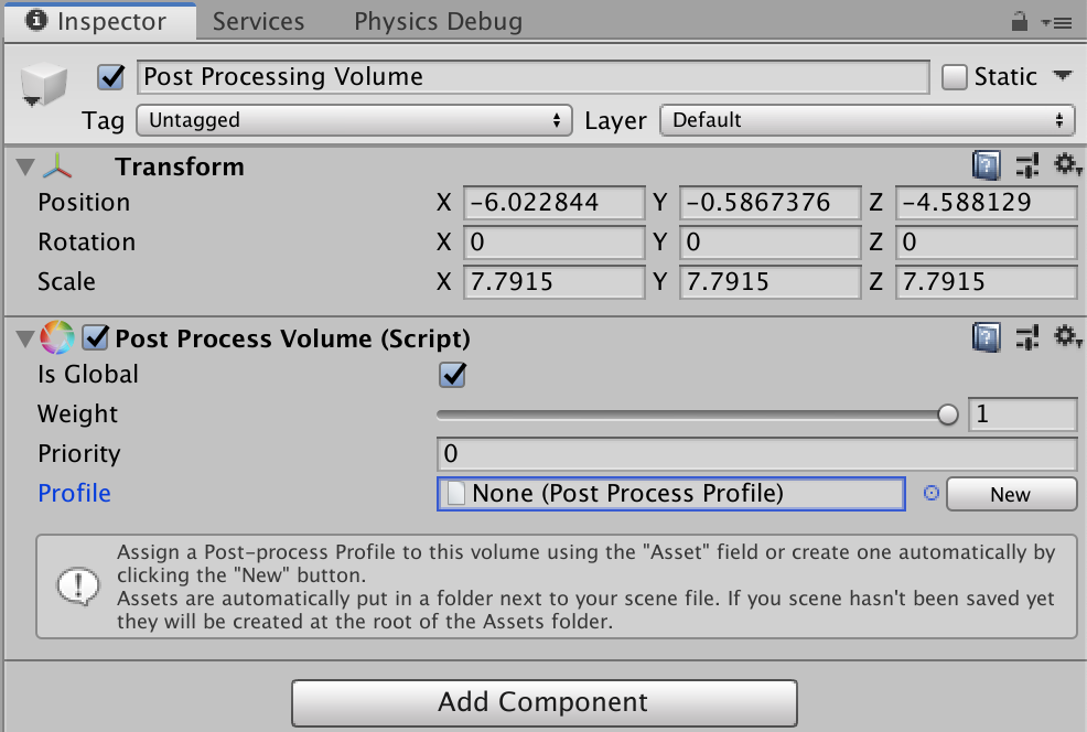 Note: Post-Processing Profiles are Project Assets that can be shared easily between your Scenes and Cameras. They can even be shared between different Projects or on the Asset Store.