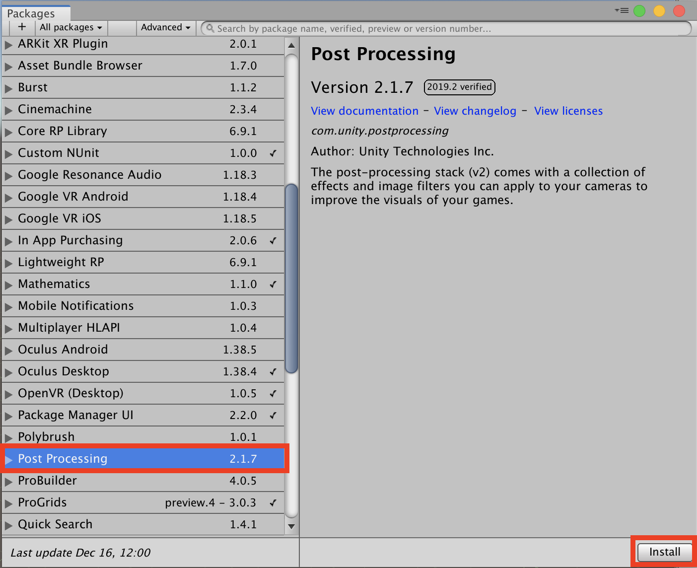 3. Find the Post Processing on the left side and click install on the bottom right corner.