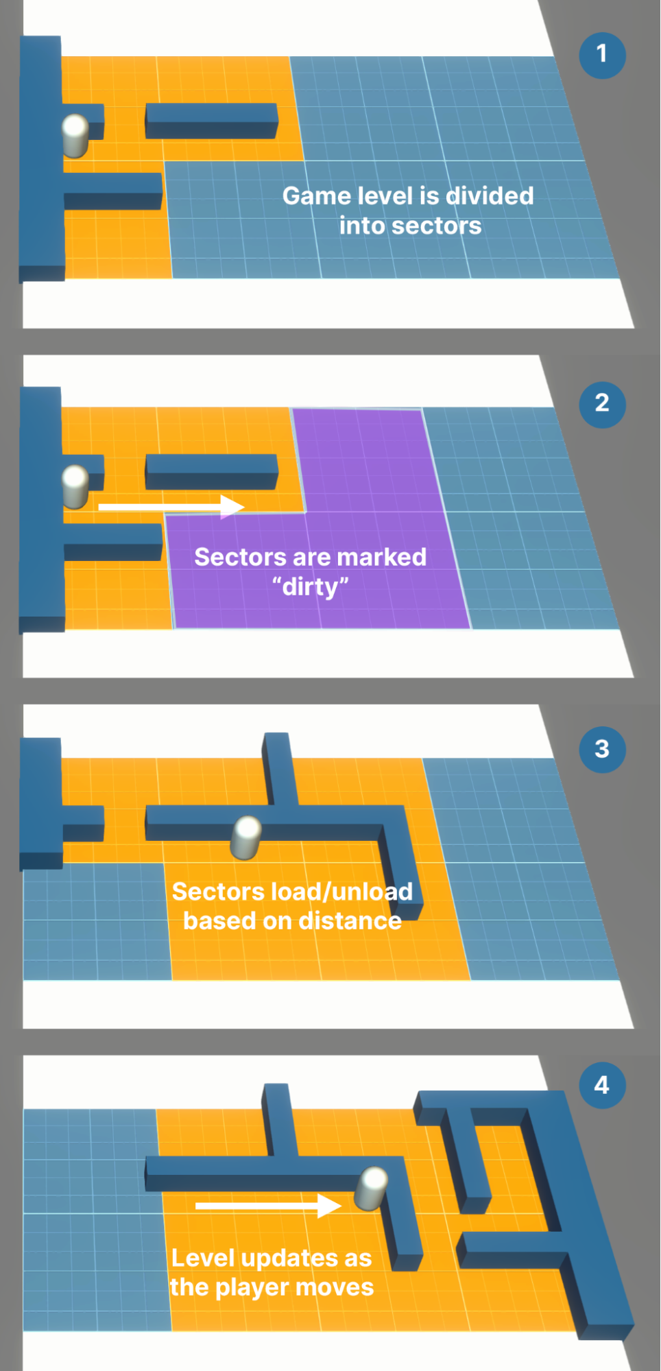 - A manager script tracks the player's movement and determines which sectors are relevant based on the player's current location.