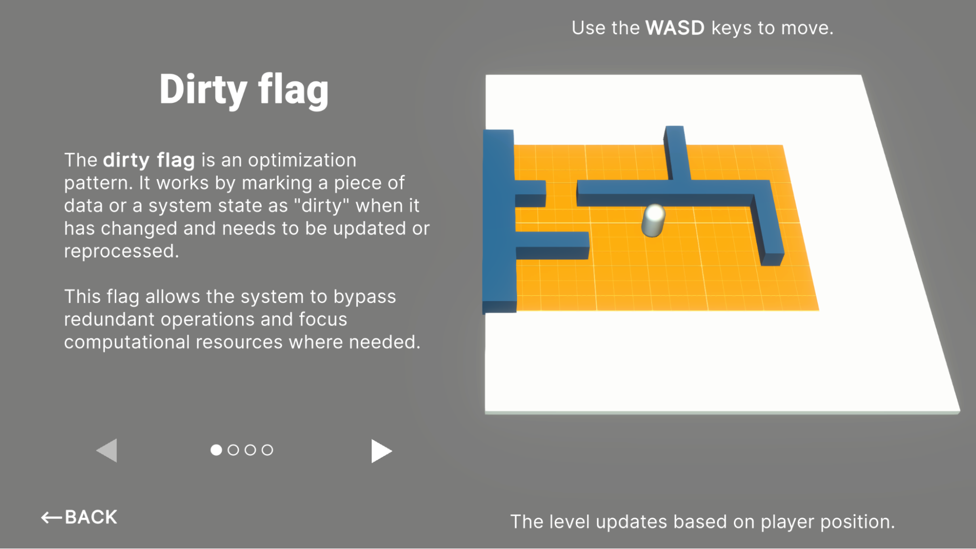 This tutorial explains the dirty flag pattern and how it can be used to reduce overhead at runtime by only applying updates to selected GameObjects at runtime.