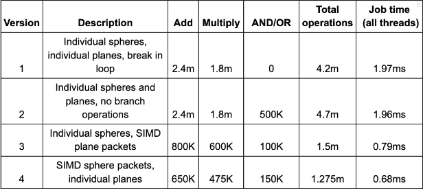 A great way to check progress of SIMD mathematics optimizations is to use the Burst Inspector to examine assembled code. For brevity, we’ve omitted the Burst-generated code from this guide, but the table below shows an approximation of the complexity of each version, gained by manually counting the number of mathematical operations (multiply, add, bitwise and logical ANDs and ORs) that would be performed in a scene with 100,000 spheres. For the purpose of counting operations, we’re assuming that every mathematical operation has the same performance impact, regardless of whether it’s add or multiply, scalar or SIMD.