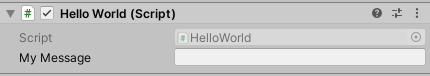 5. In the Unity Editor, select the ScriptObject GameObject and look at the HelloWorld Component in the Inspector. A new property appears where you can type a custom message.