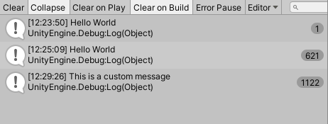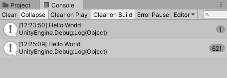 4. Play the game and look at the Console window. This time, a counter appears next to the “Hello World” message. This counter shows how many times the script has run and displayed the message.